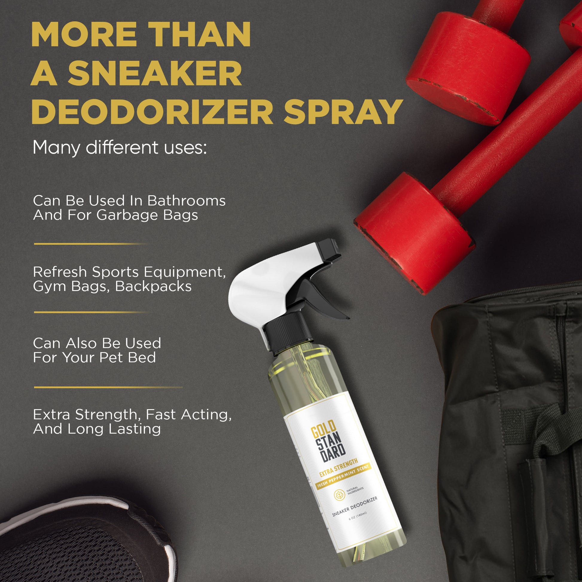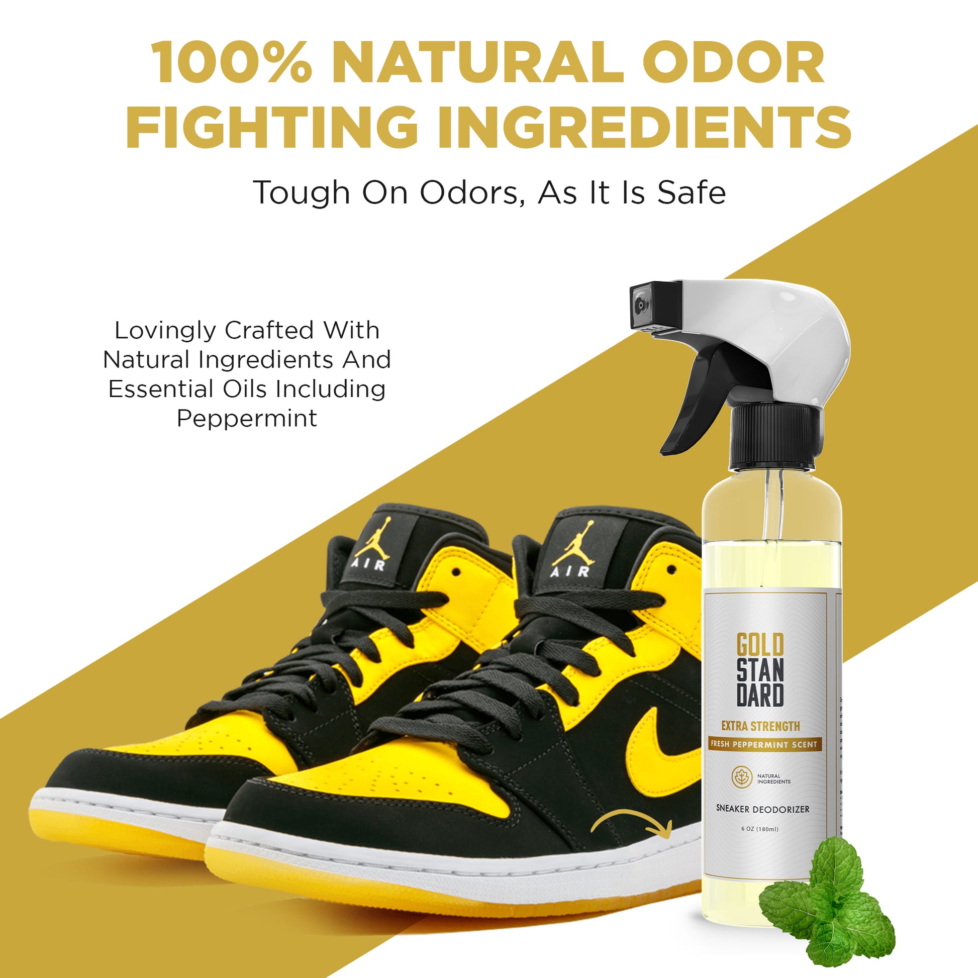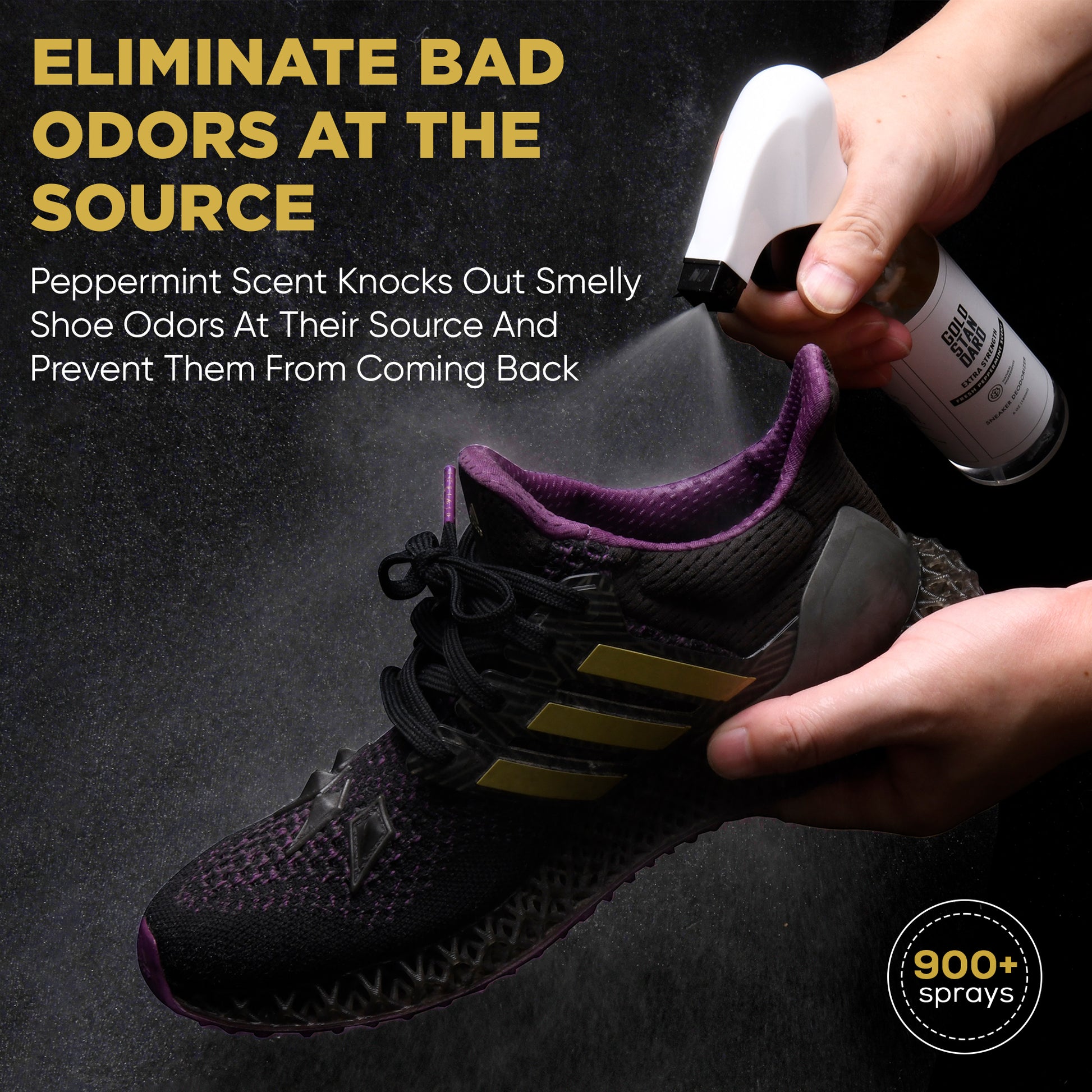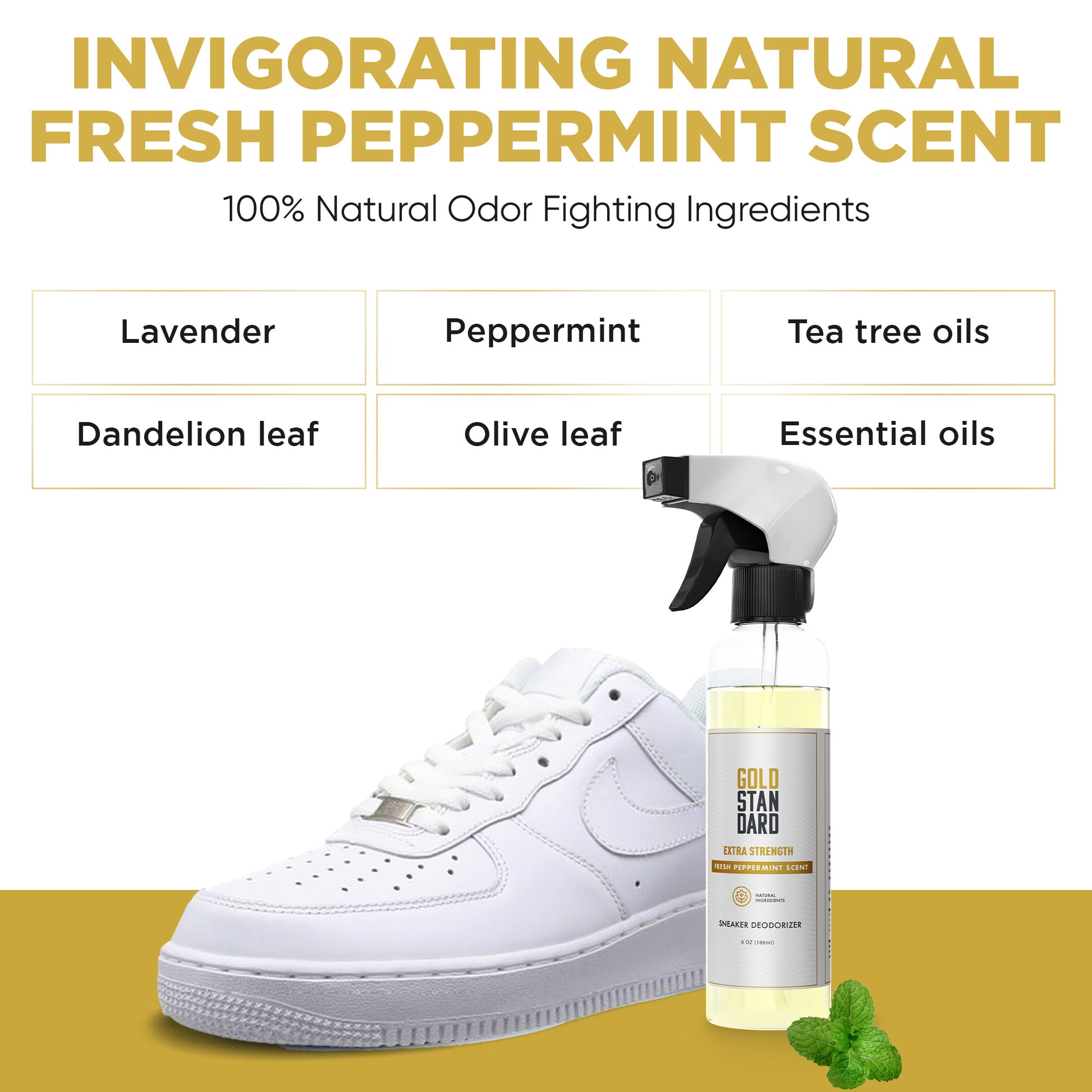 Step into freshness with your new Gold Standard Shoe Deodorizer Spray – a natural shoe odor eliminator that removes bad smells from your shoes and leaves behind a long-lasting, refreshing peppermint scent. A powerhouse that's unmatched and not afraid to tackle the toughest odors. With our concentrated formula, a little truly goes a long way.